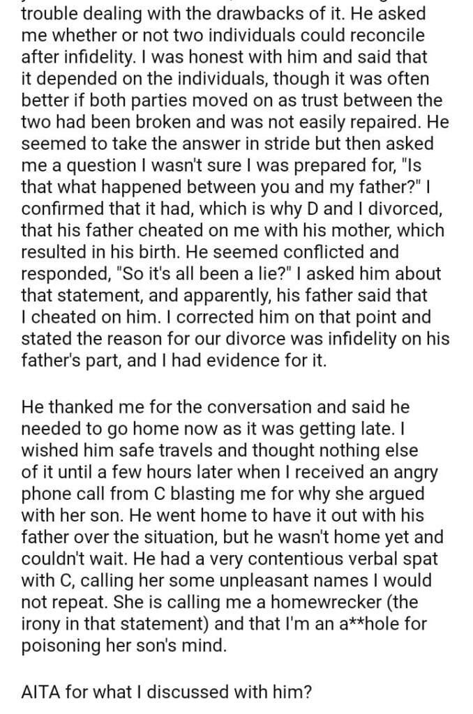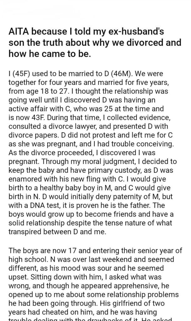 AITA because I told my ex-husband’s son the truth about why we divorced and how he came to be.