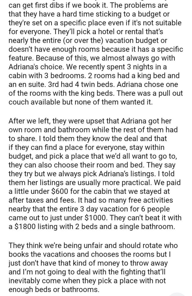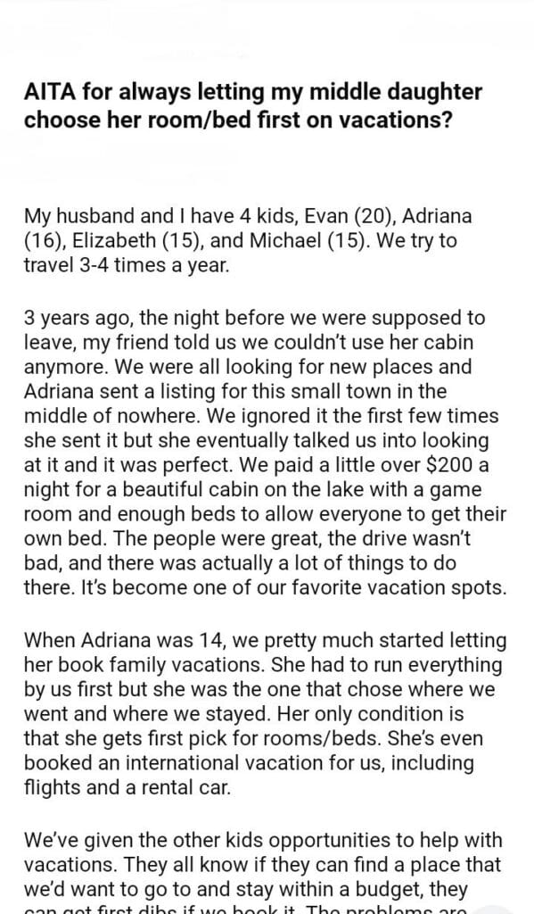 AITA for always letting my middle daughter choose her room/bed first on vacations?