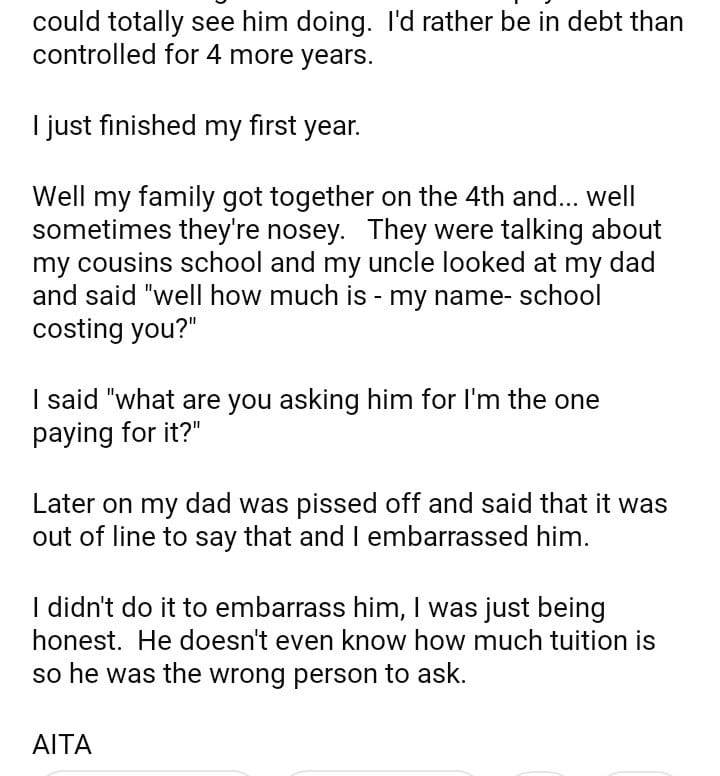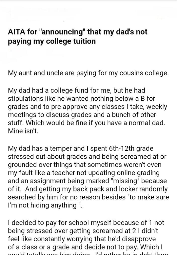 AITA for “announcing” that my dad’s not paying my college tuition
