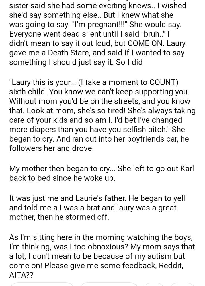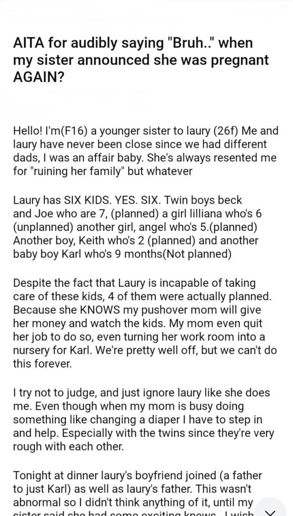 AITA for audibly saying “Bruh..” when my sister announced she was pregnant AGAIN?