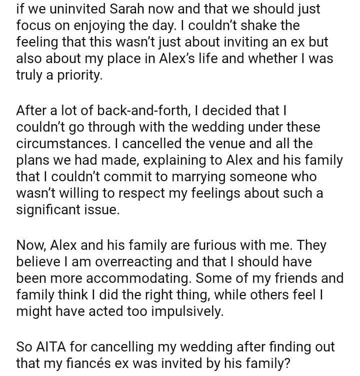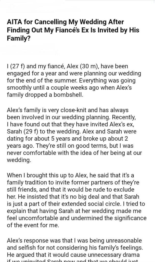 AITA for Cancelling My Wedding After Finding Out My Fiancé’s Ex Is Invited by His Family?