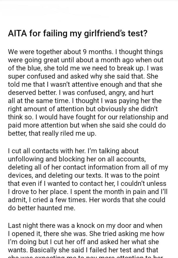AITA for failing my girlfriend’s test?