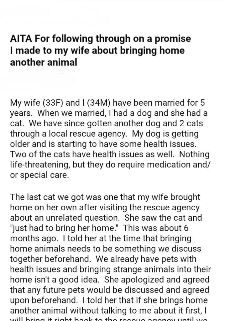 AITA For following through on a promise I made to my wife about bringing home another animal