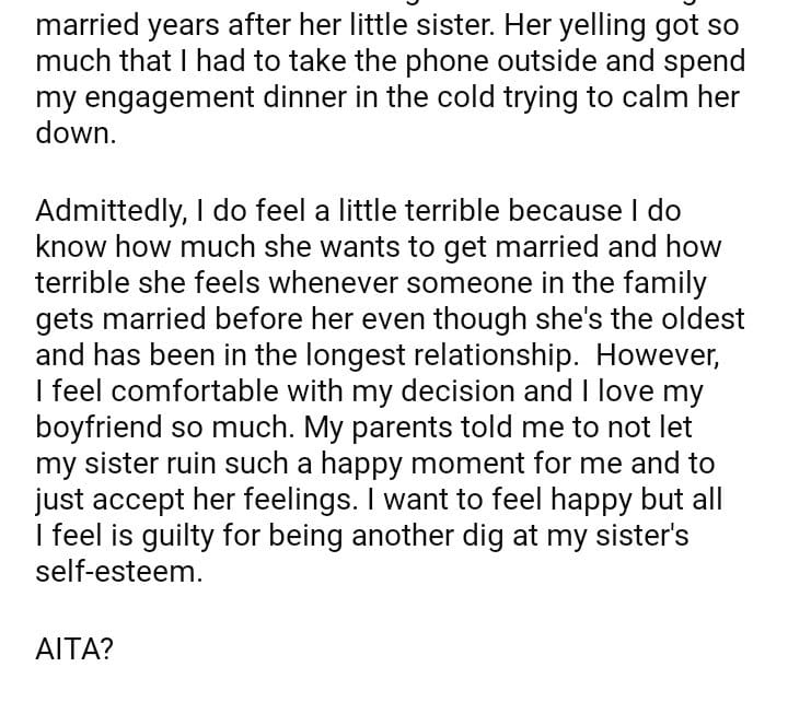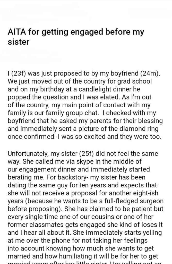 AITA for getting engaged before my sister