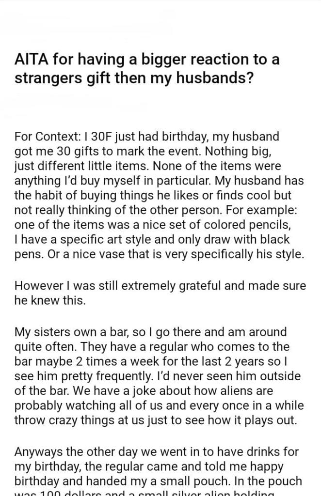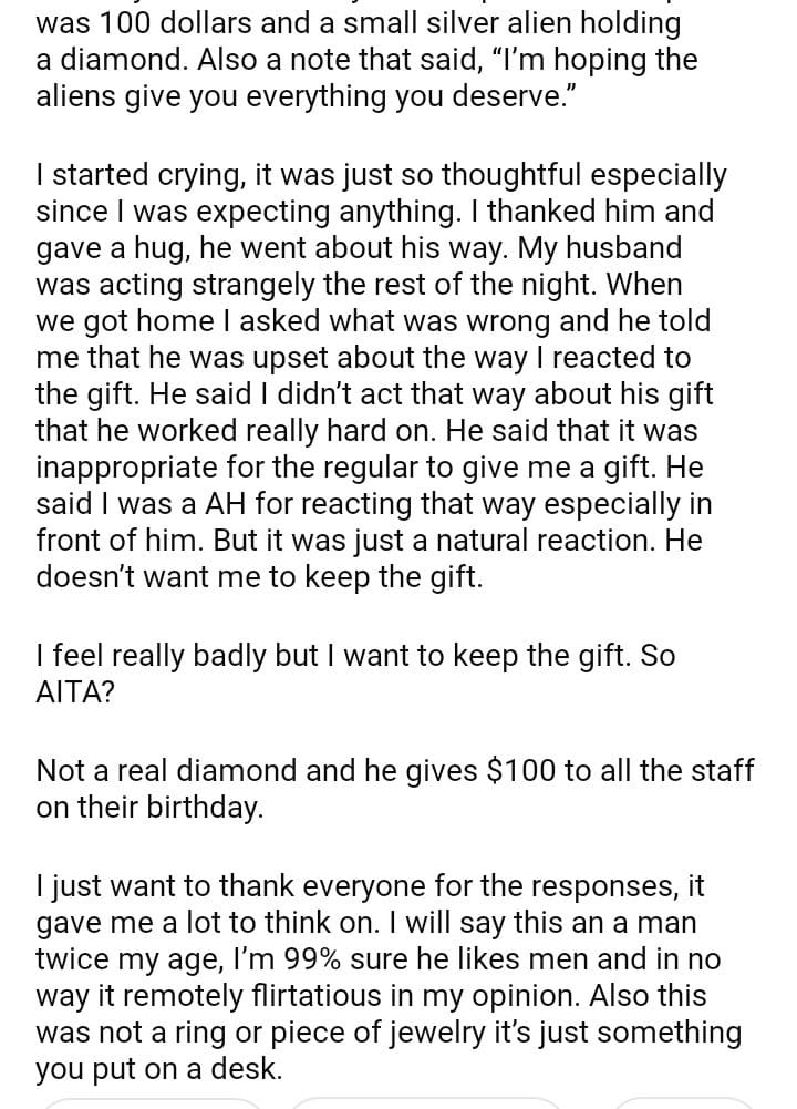 AITA for having a bigger reaction to a strangers gift then my husbands?
