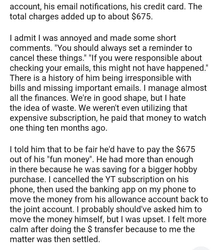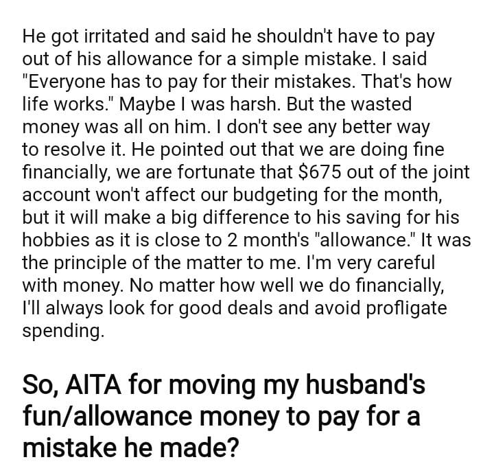 AITA for making my husband pay for a mistake out of his “allowance”?