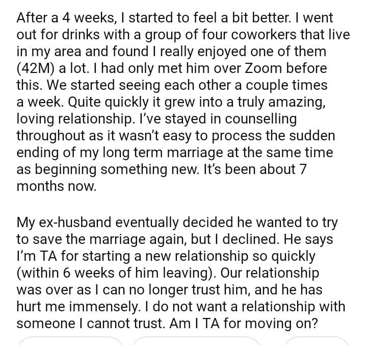 AITA for moving on so quickly after my husband left me?