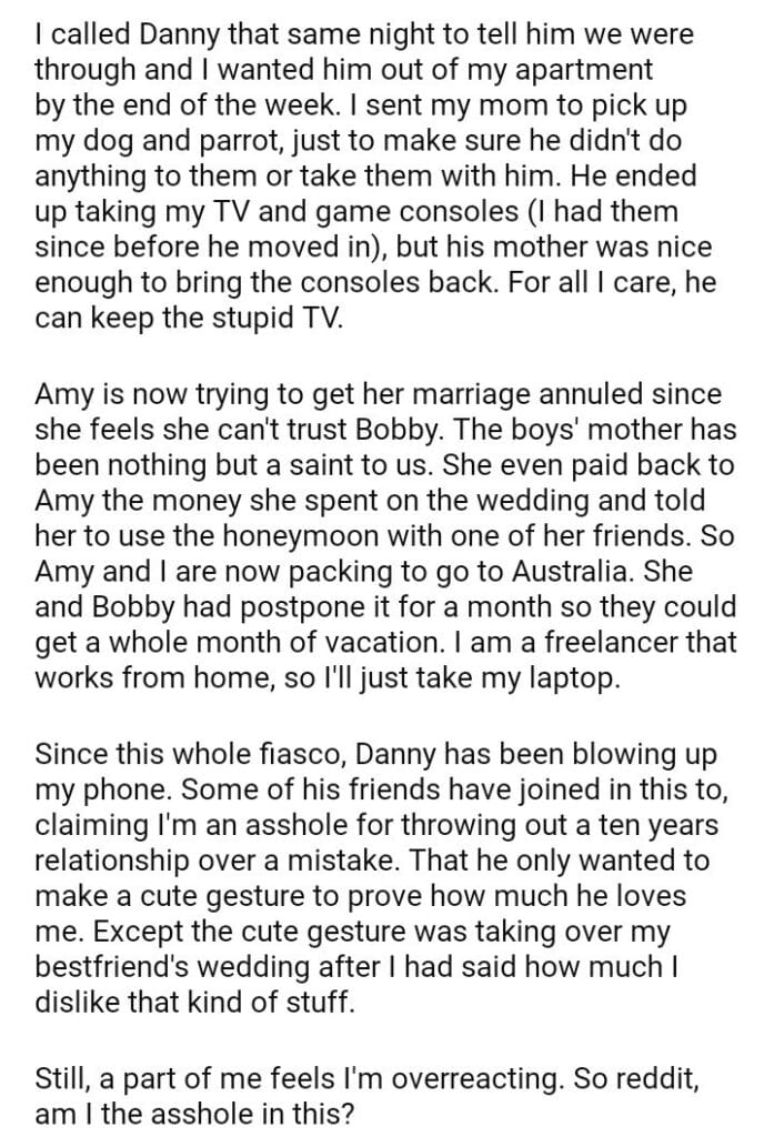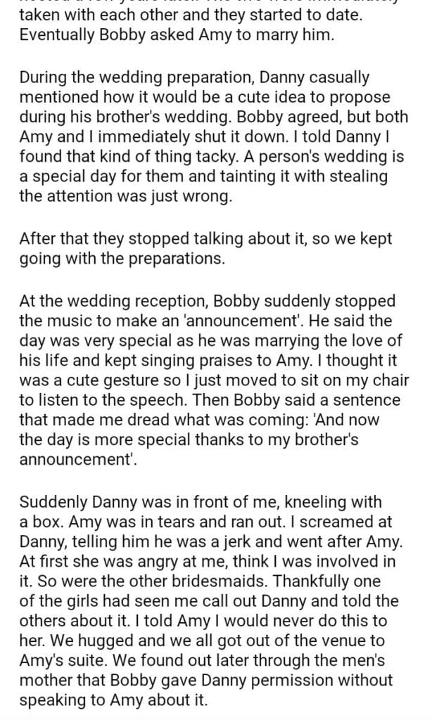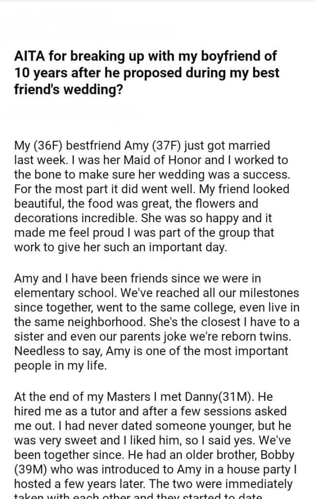 AITA for my boyfriend of 10 years after he proposed during my best friend’s wedding?