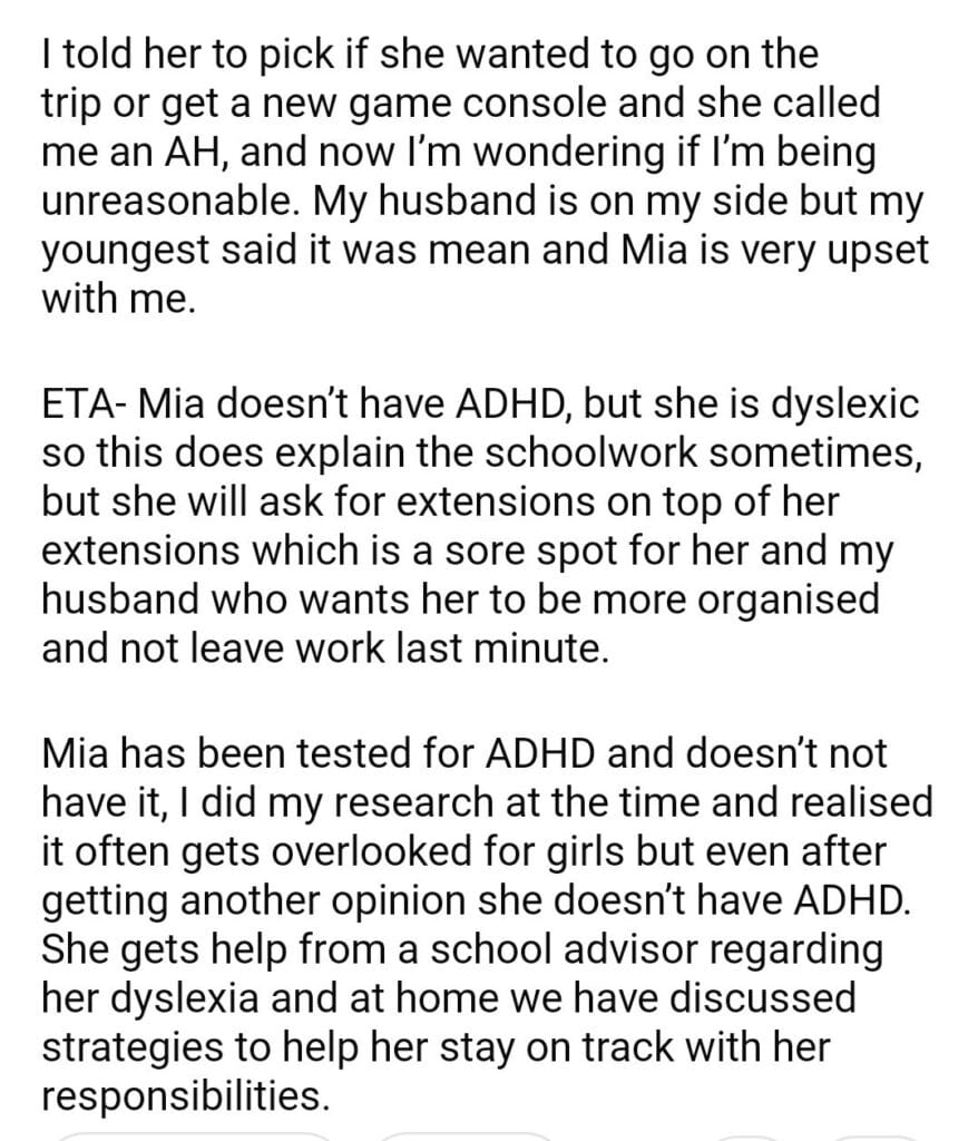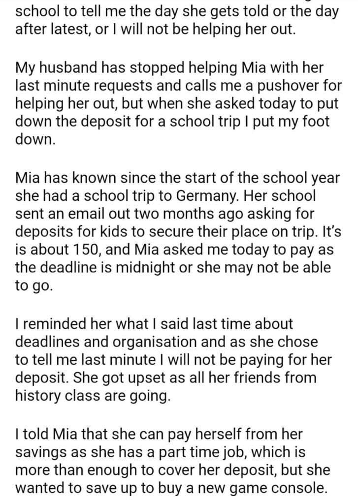 AITA for my daughters school trip?