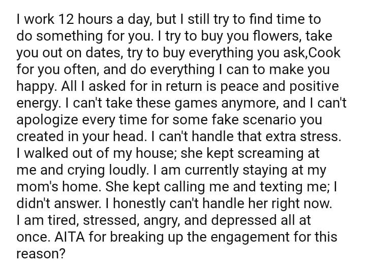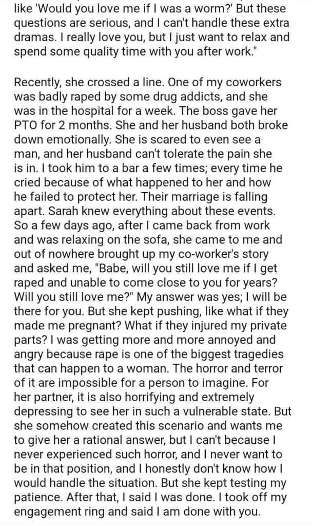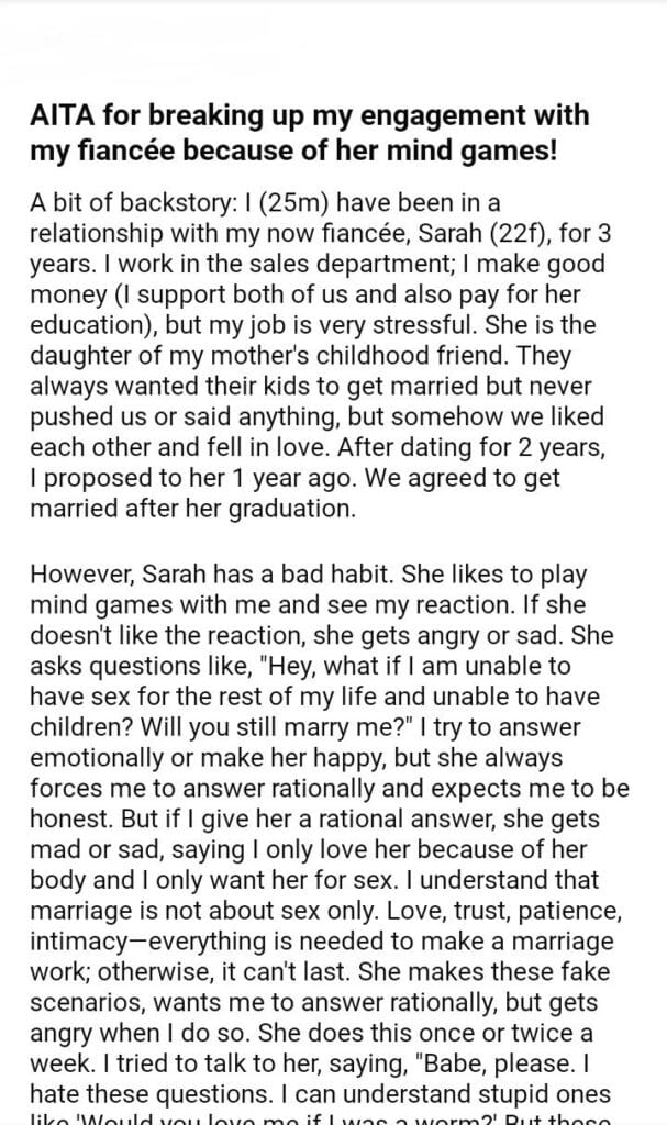 AITA for my engagement with my fiancée because of her mind