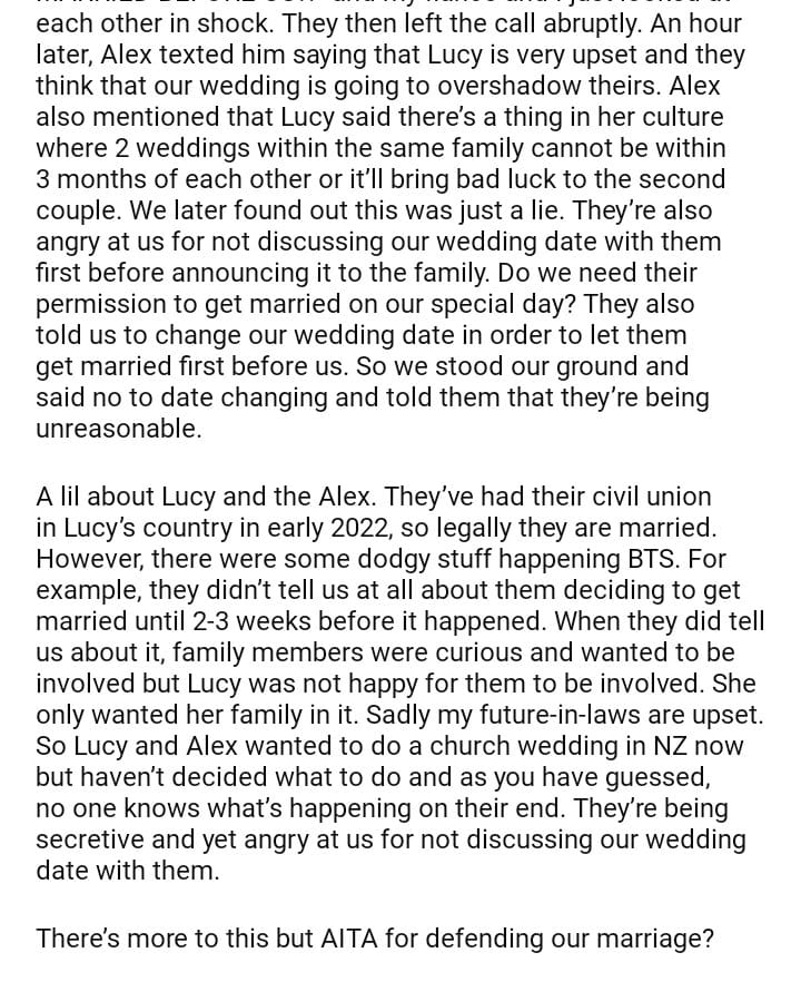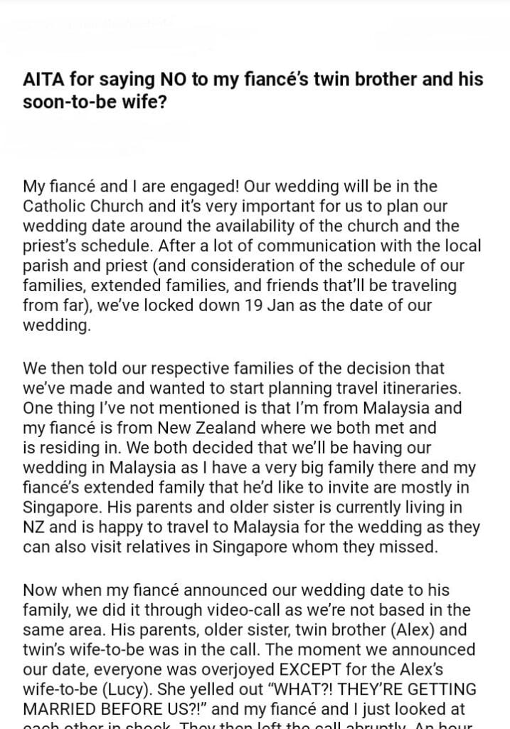 AITA for my fiancé’s twin brother and his soon-to-be wife?