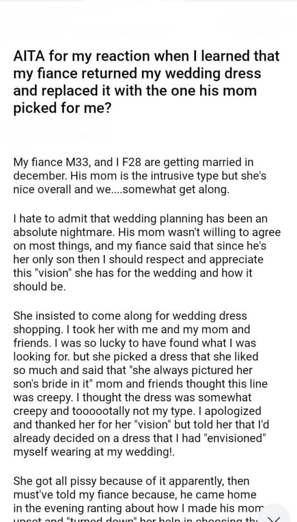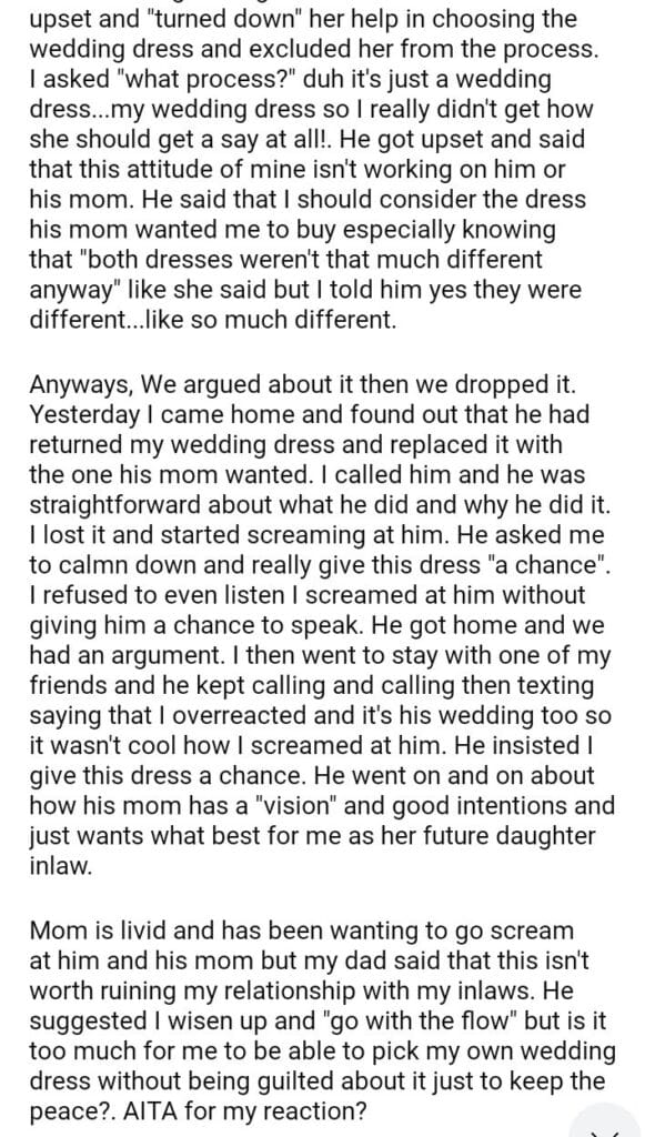 AITA for my reaction when I learned that my fiance returned my wedding dress