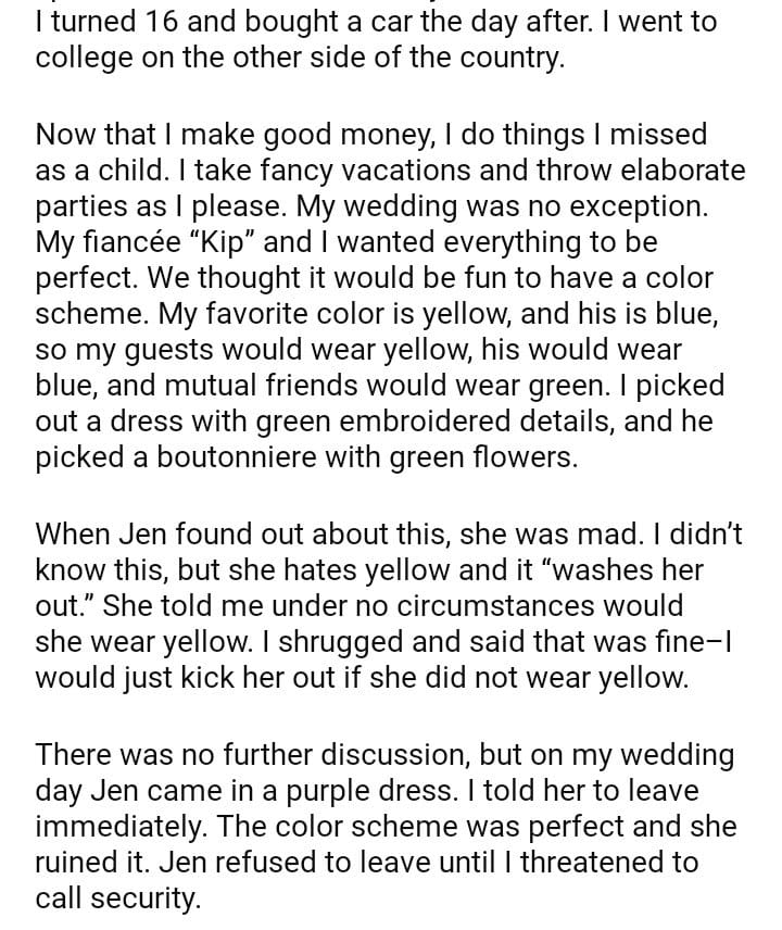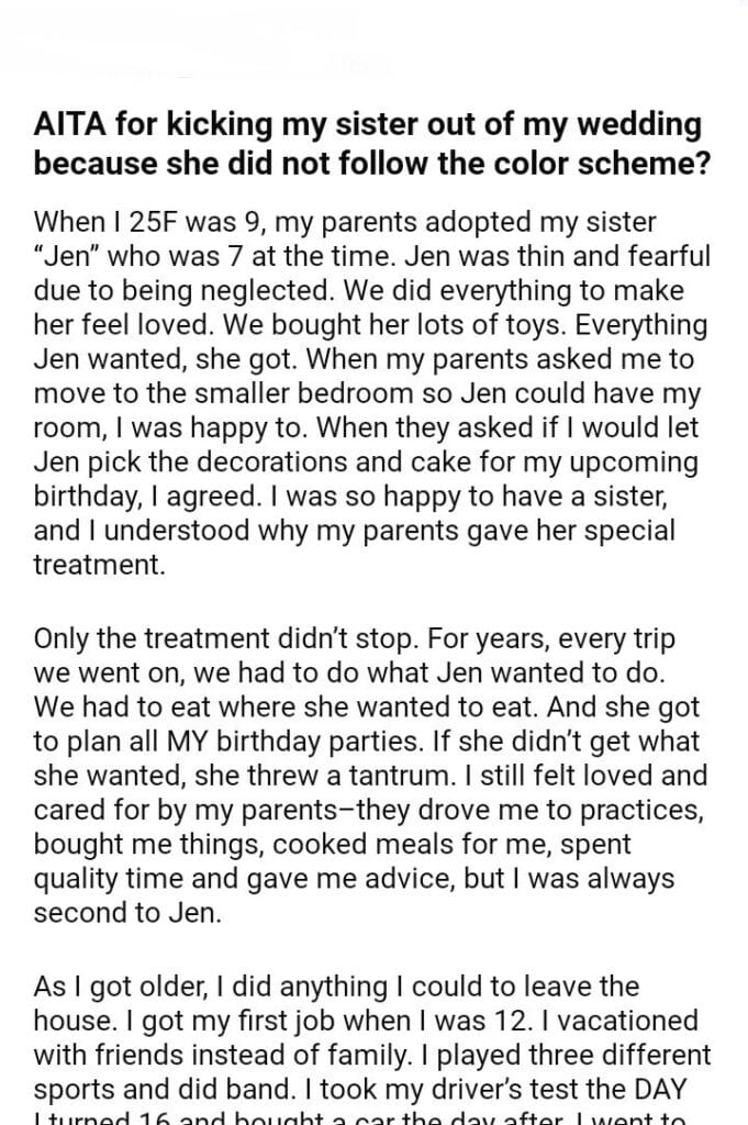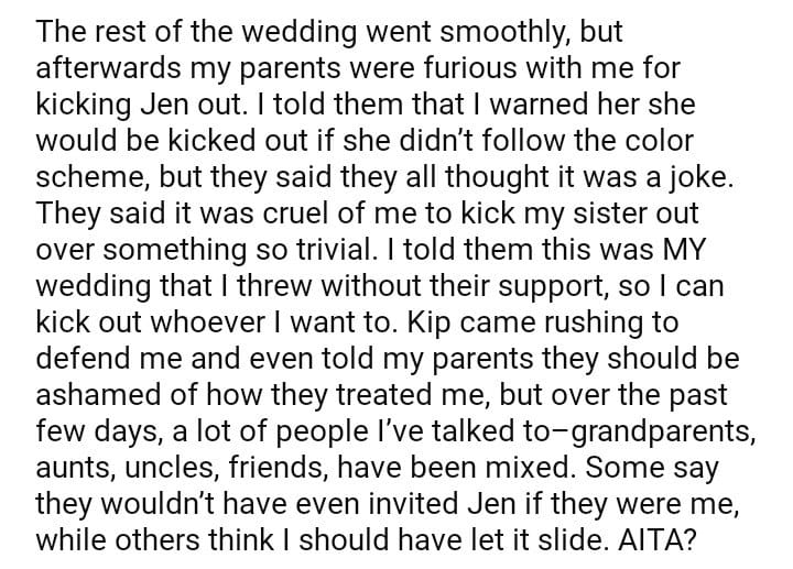 AITA for my sister out of my wedding because she did not follow the color scheme?
