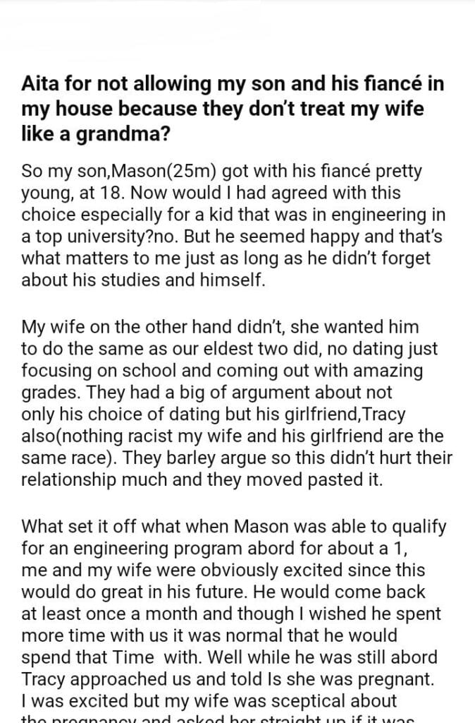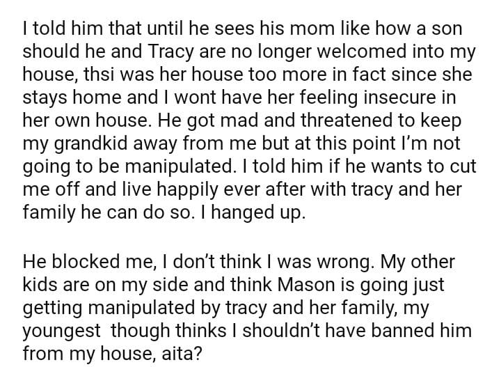 Aita for not allowing my son and his fiancé in my house