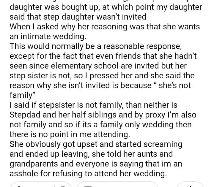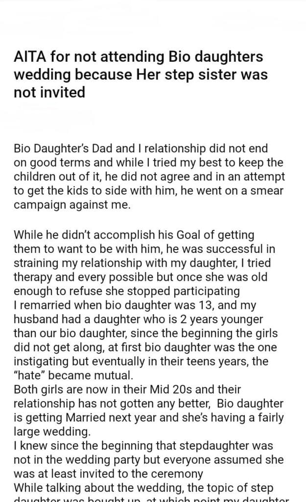 AITA for not attending Bio daughters wedding because Her step sister was not invited