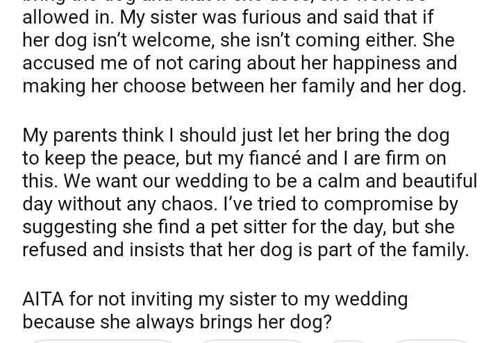 AITA for not inviting my sister to my wedding because she always brings her dog?