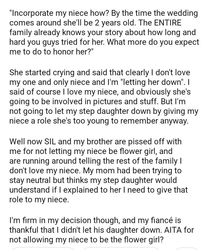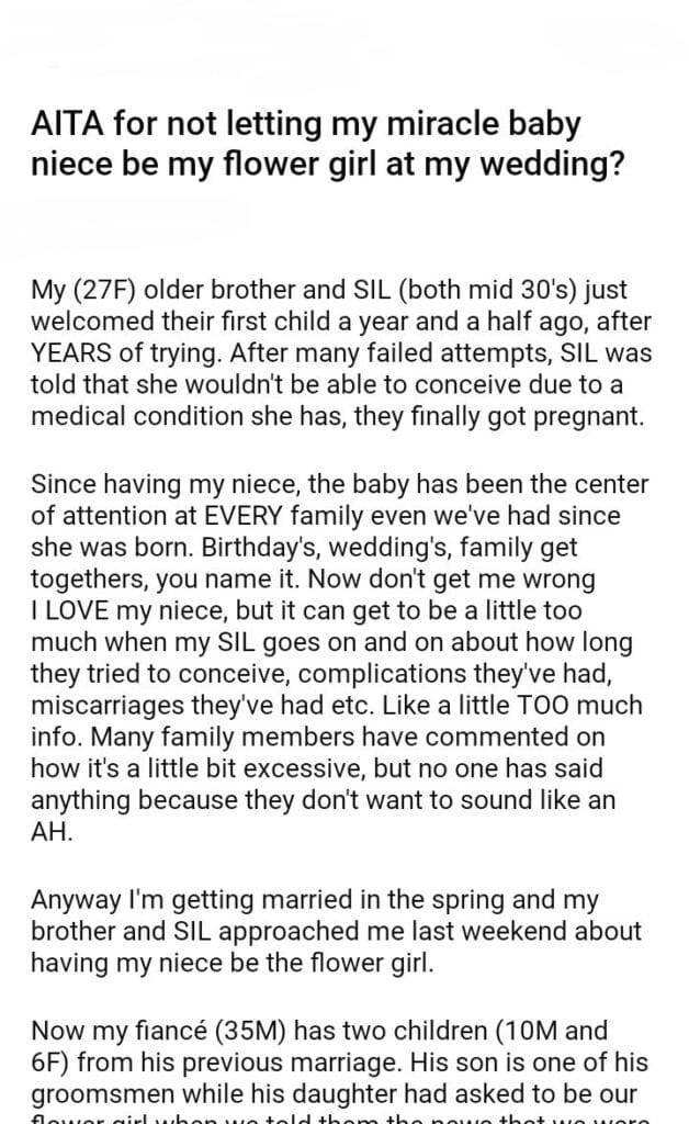 AITA for not letting my miracle baby niece be my flower girl at my wedding?