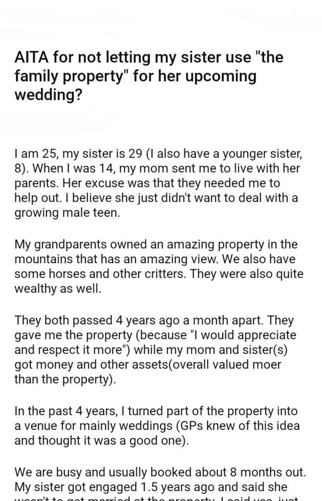 AITA for not letting my sister use “the family property” for her upcoming wedding?