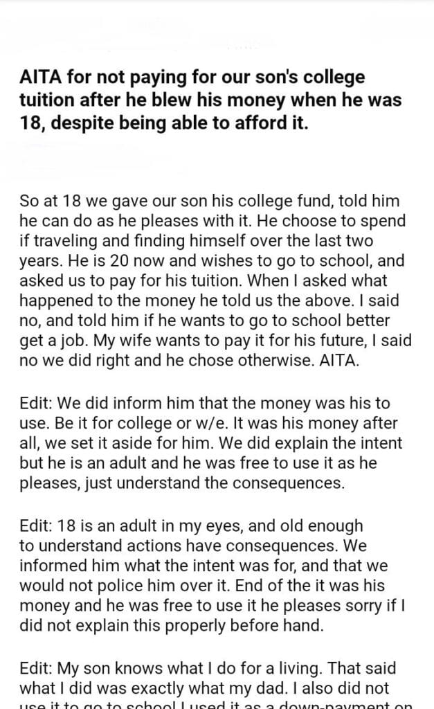 AITA for not paying for our son’s college tuition