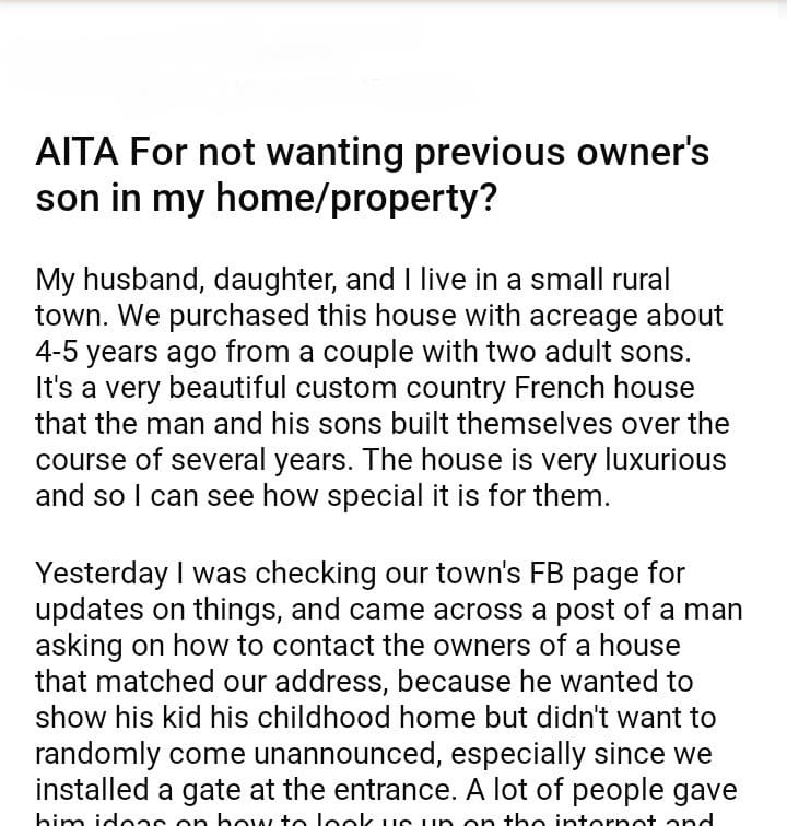 AITA For not wanting previous owner’s son in my home/property?