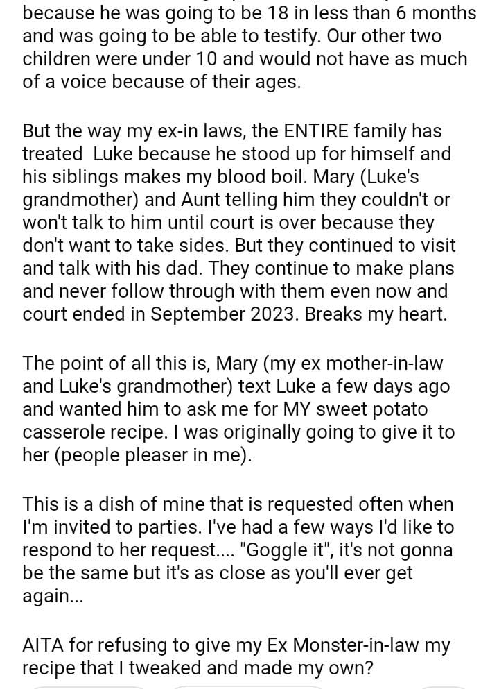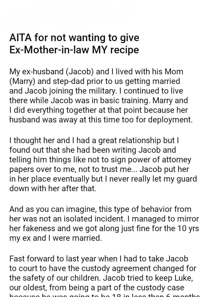 AITA for not wanting to give Ex-Mother-in-law MY recipe