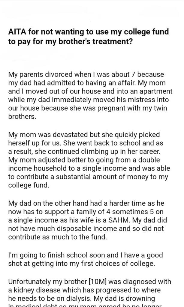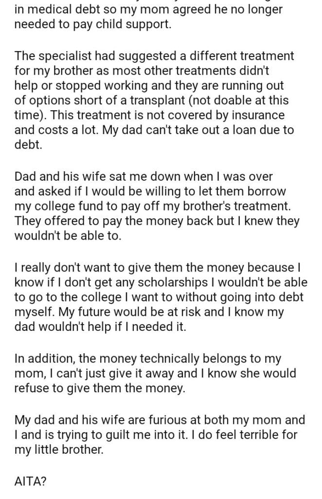 AITA for not wanting to use my college fund to pay for my brother’s treatment?