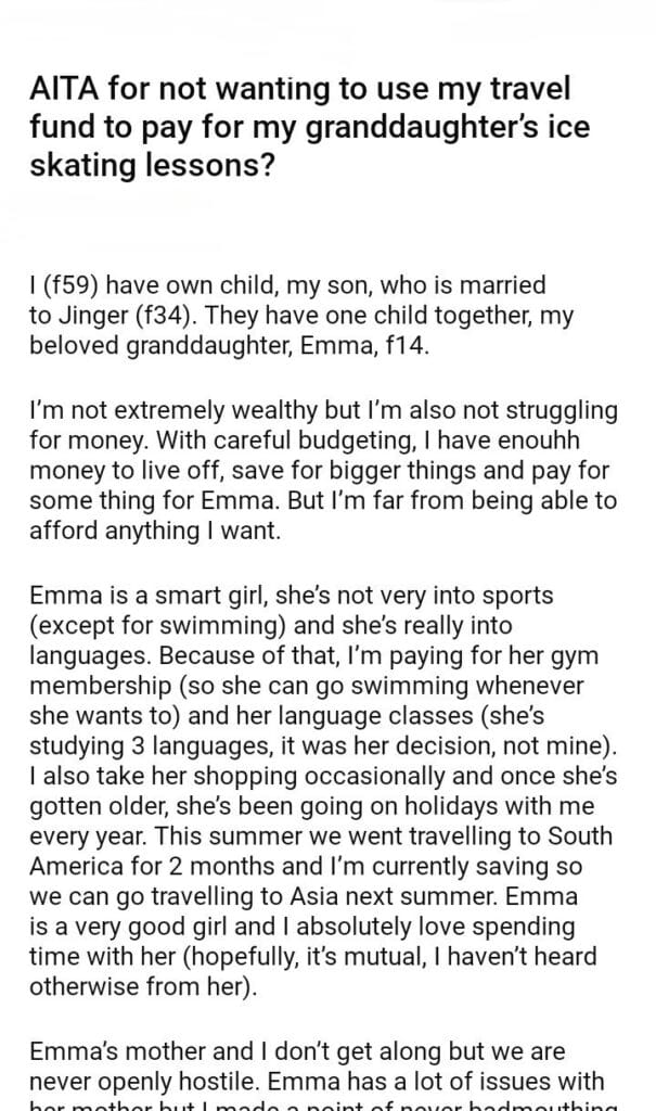 AITA for not wanting to use my travel fund to pay for my granddaughter’s ice skating lessons?