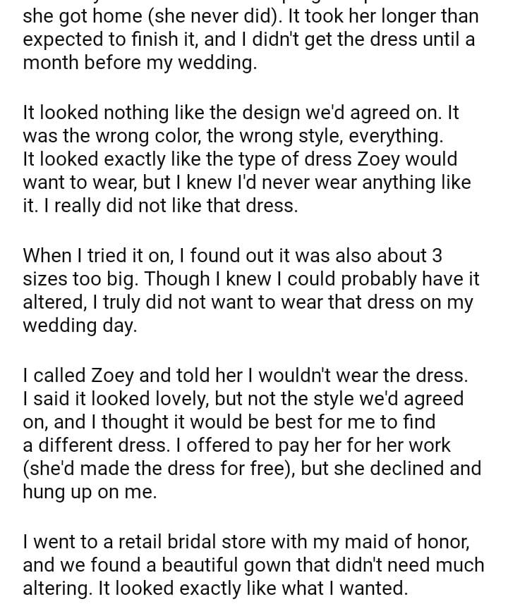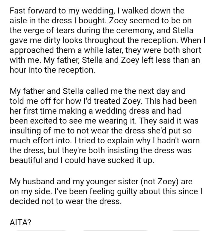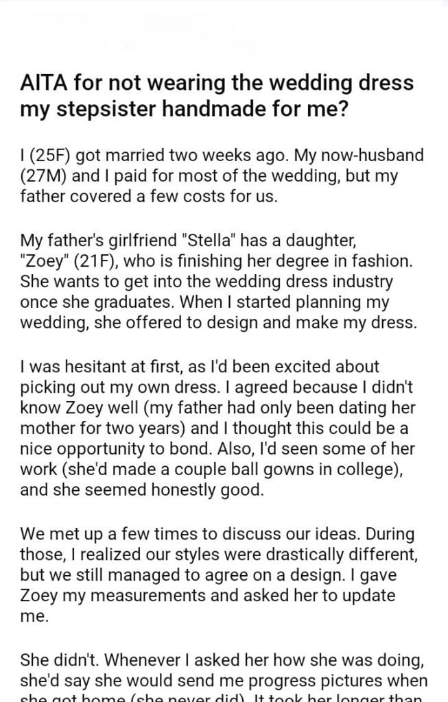AITA for not wearing the wedding dress my stepsister handmade for me?