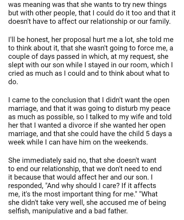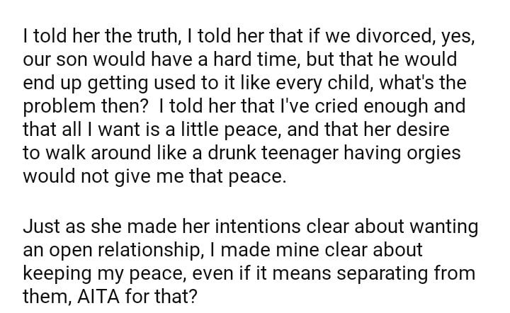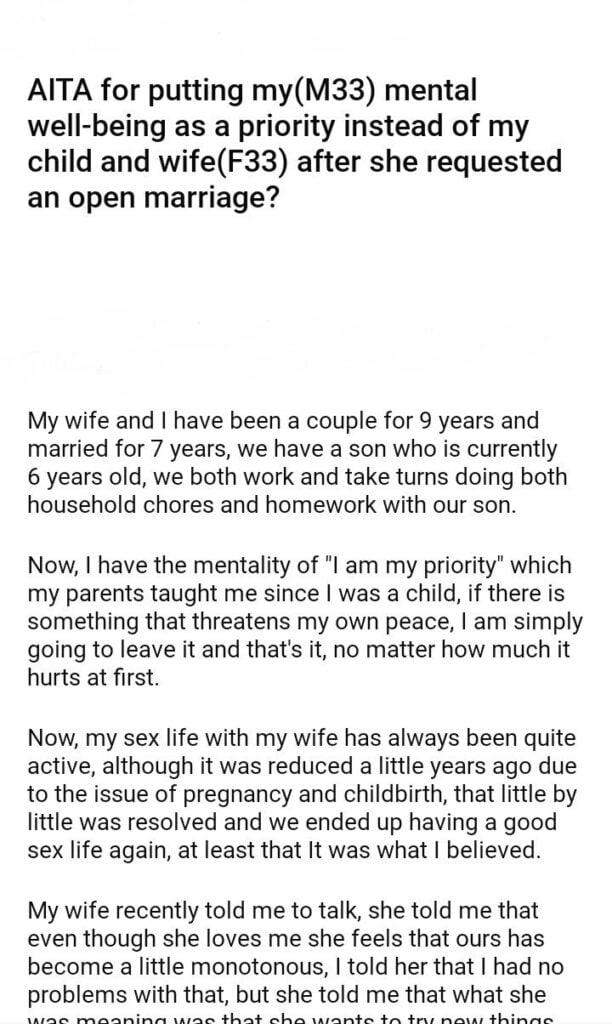AITA for putting my(M33) mental well-being as a priority instead of my child and wife(F33) after she requested an open marriage?