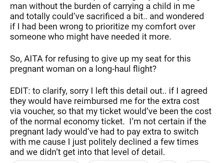 AITA for Refusing to Give My Seat for a Pregnant Woman on a 12hr Flight?