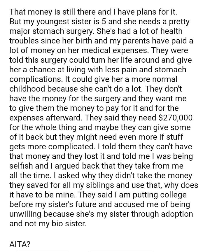 AITA for refusing to hand over my college fund for my little sister