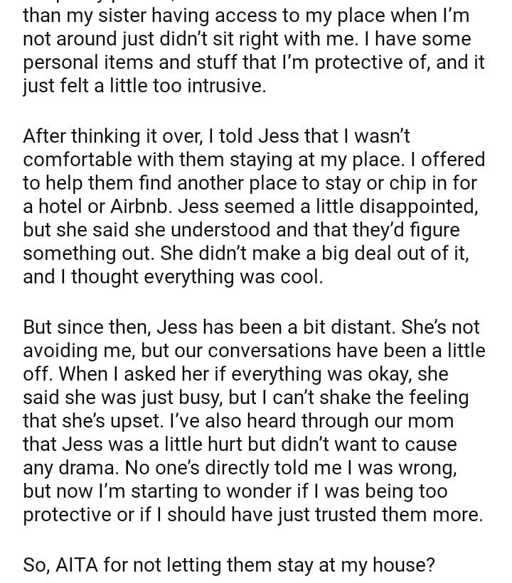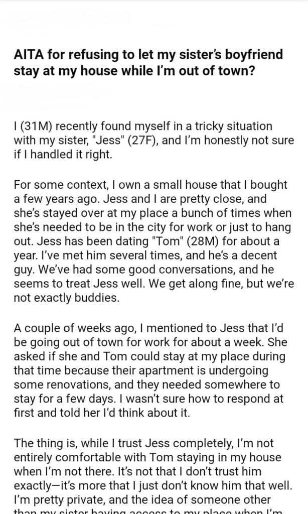 AITA for refusing to let my sister’s boyfriend stay at my house while I’m out of town?