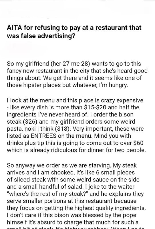 AITA for refusing to pay at a restaurant