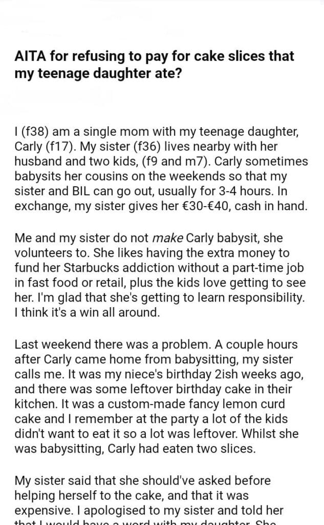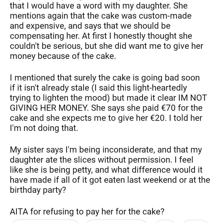 AITA for refusing to pay for cake slices that my teenage daughter ate?
