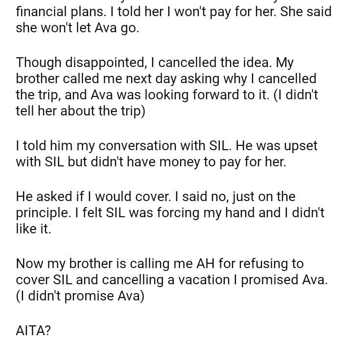 AITA for refusing to pay for SIL and cancelling the vacation?