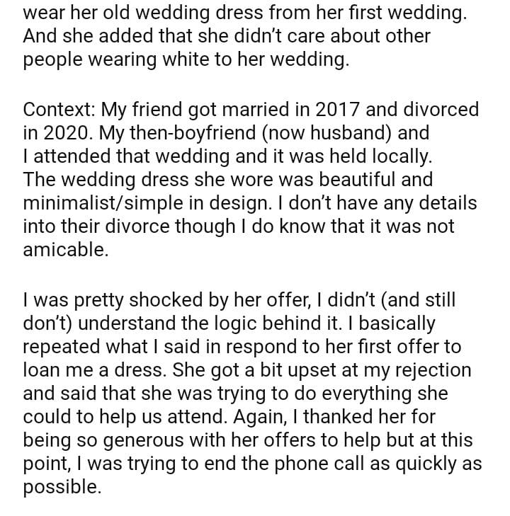 AITA For Refusing To Wear My Friend’s Old Wedding Dress