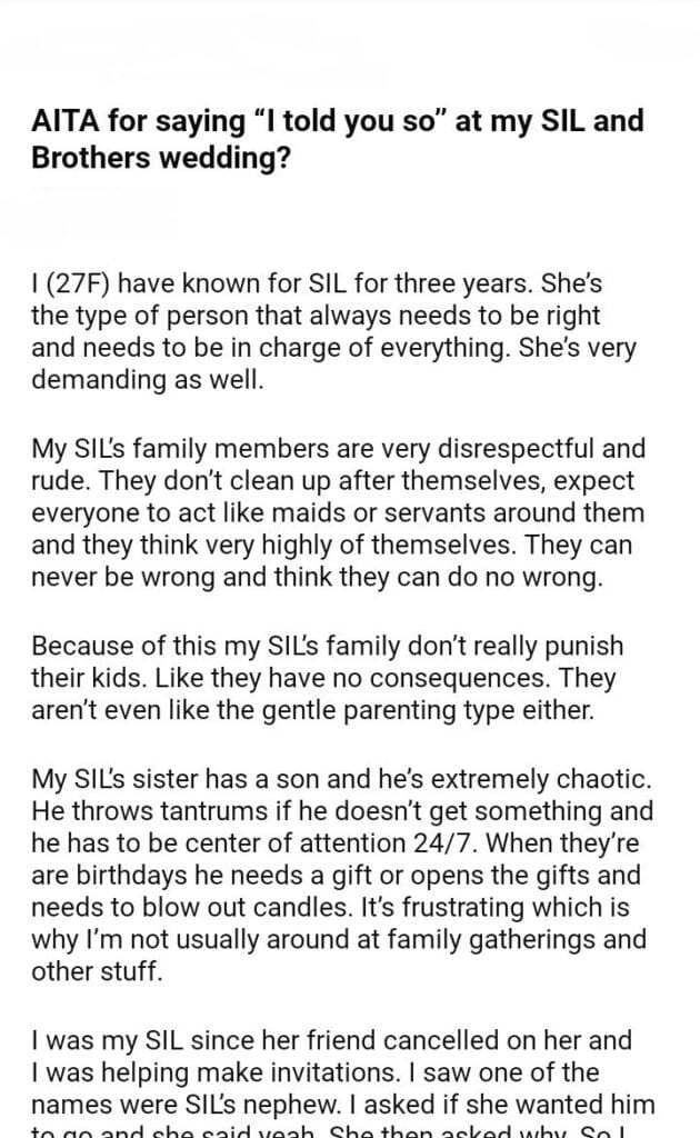 AITA for saying “I told you so” at my SIL and Brothers wedding?