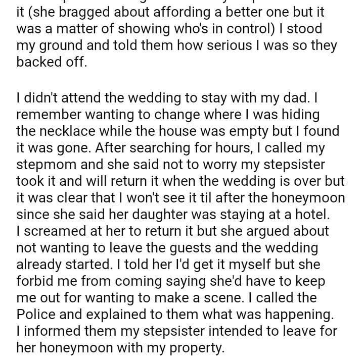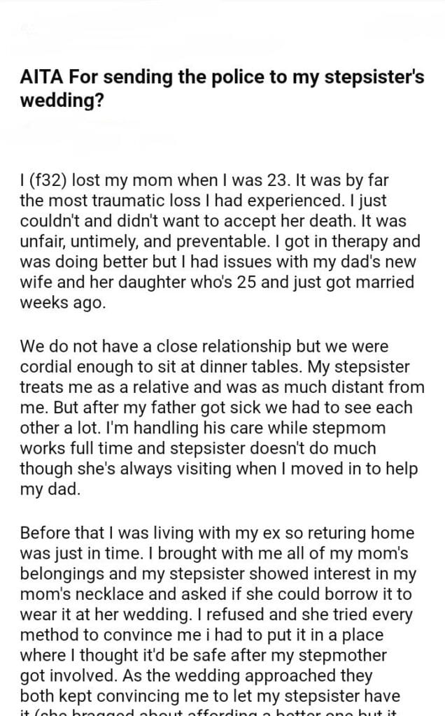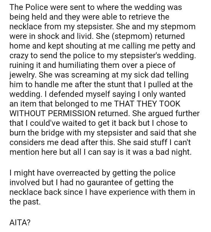 AITA For sending the police to my stepsister’s wedding?