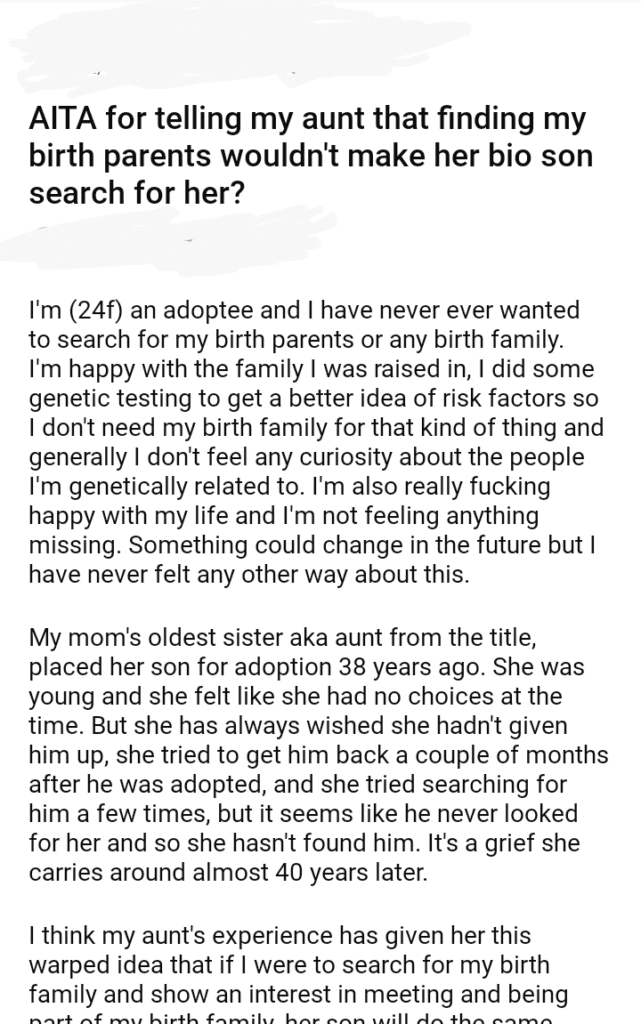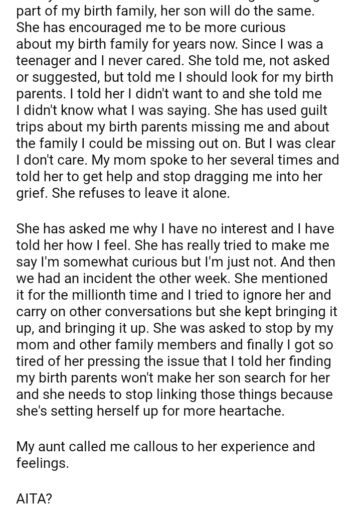 AITA for telling my aunt that finding my birth parents wouldn’t make her bio son search for her?