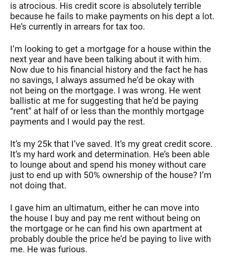 AITA For Telling My Boyfriend He Won’t Be Named On The Mortgage