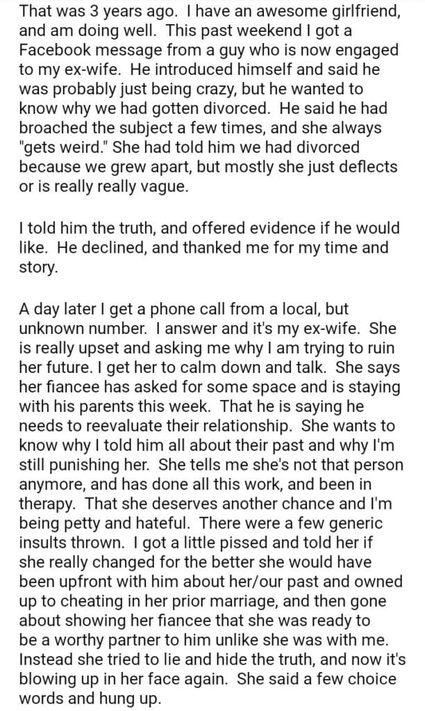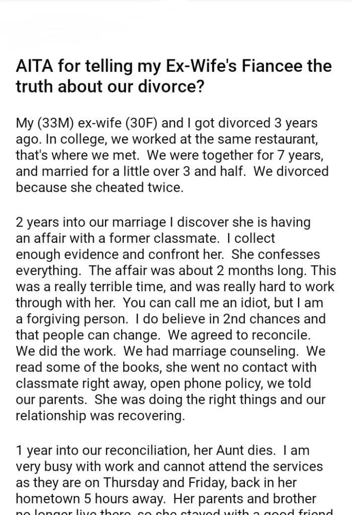 AITA for telling my Ex-Wife’s Fiancee the truth about our divorce?