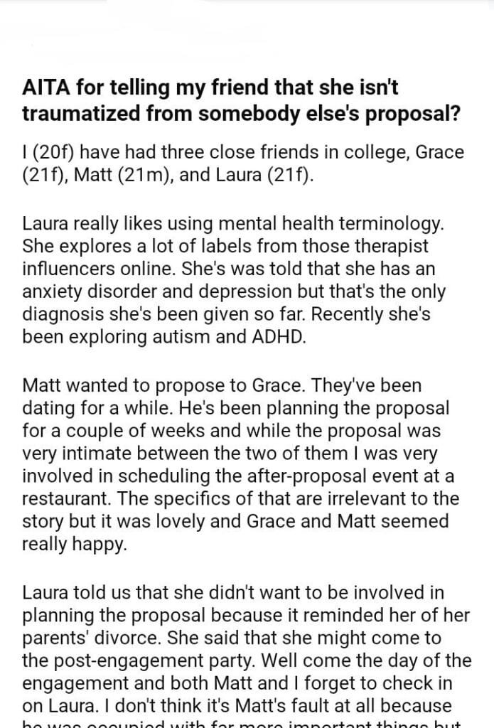 AITA for telling my friend that she isn’t from somebody else’s proposal?