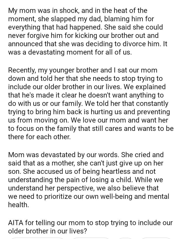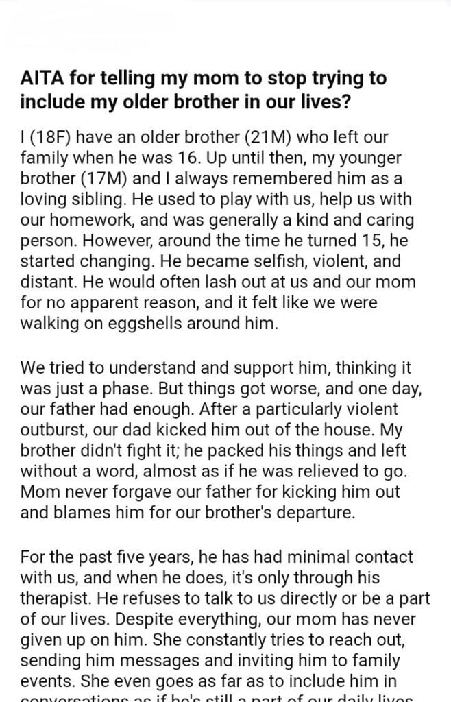 AITA for telling my mom to stop trying to include my older brother in our lives?