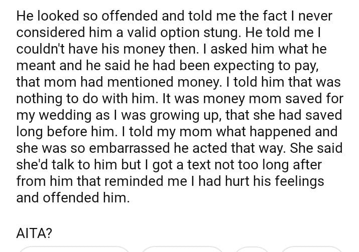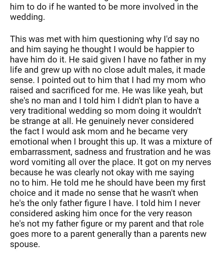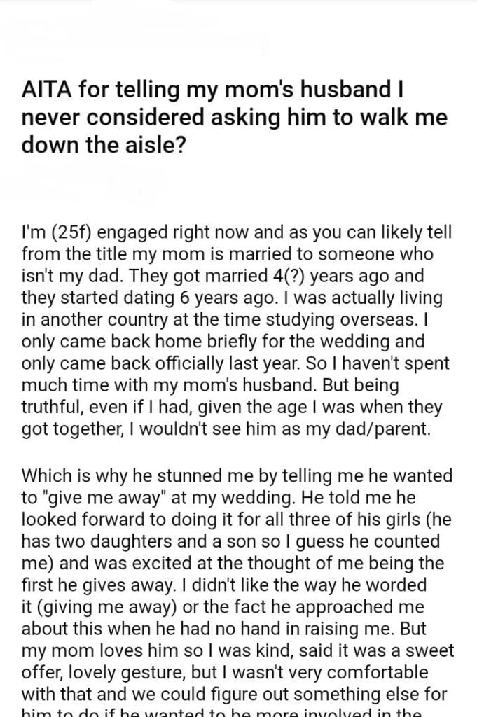 AITA for telling my mom’s husband I never considered asking him to walk me down the aisle?