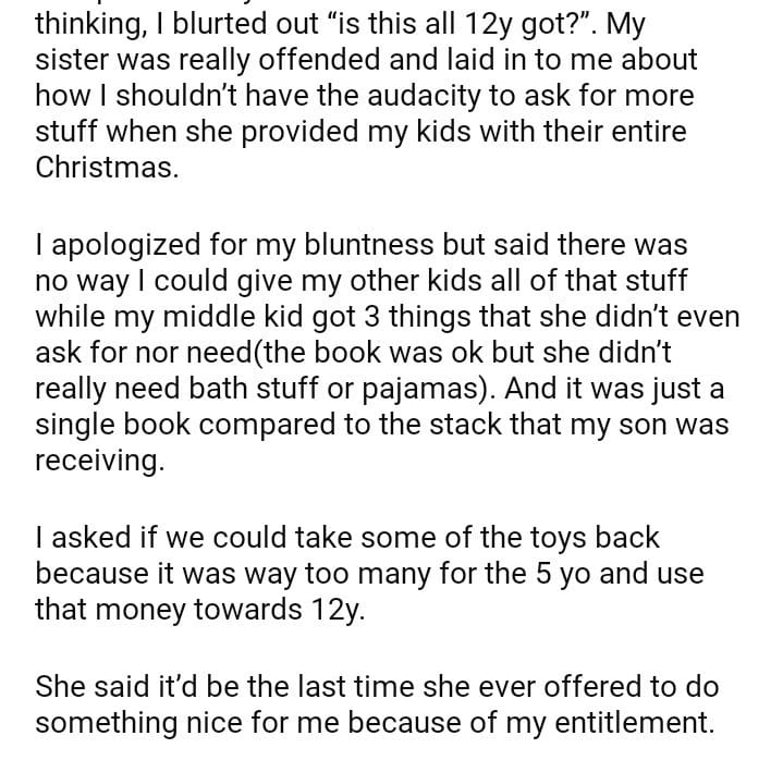 AITA for telling my sister I couldn’t accept the amount of gifts she bought for my kids