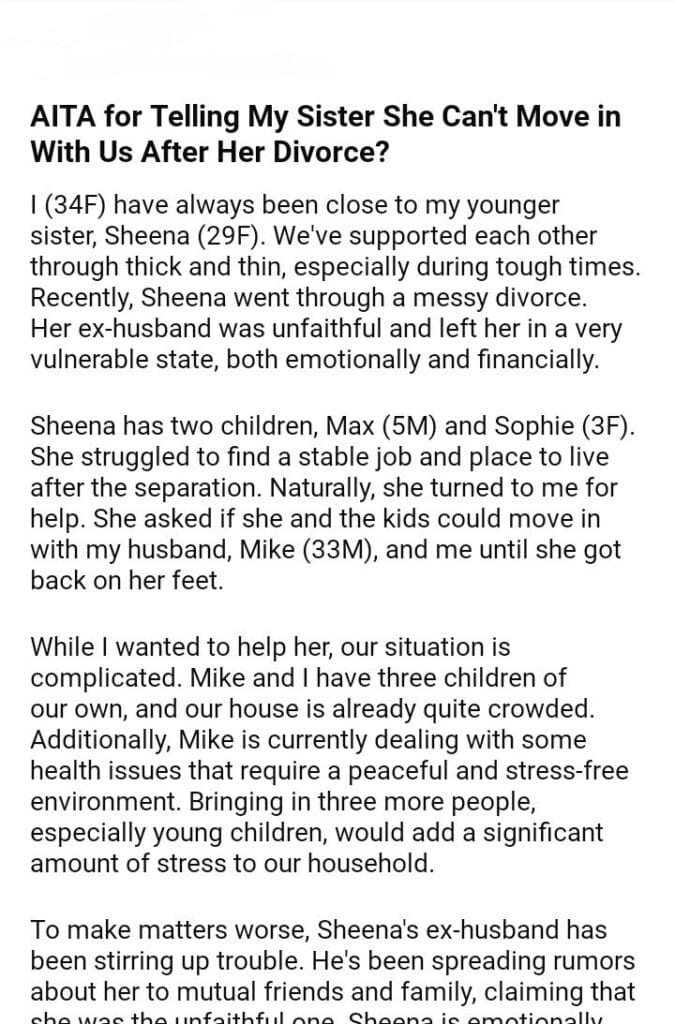 AITA for Telling My Sister She Can’t Move in With Us After Her Divorce?