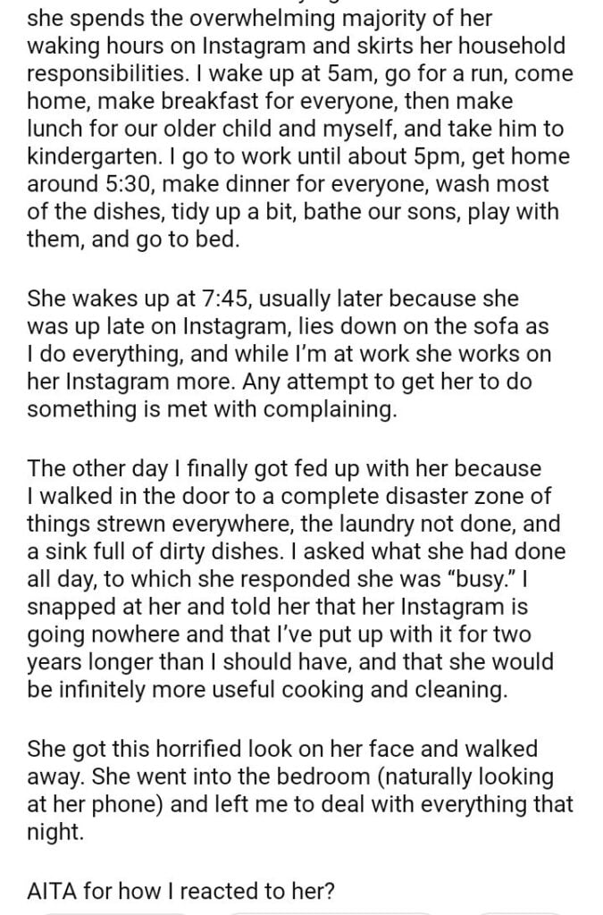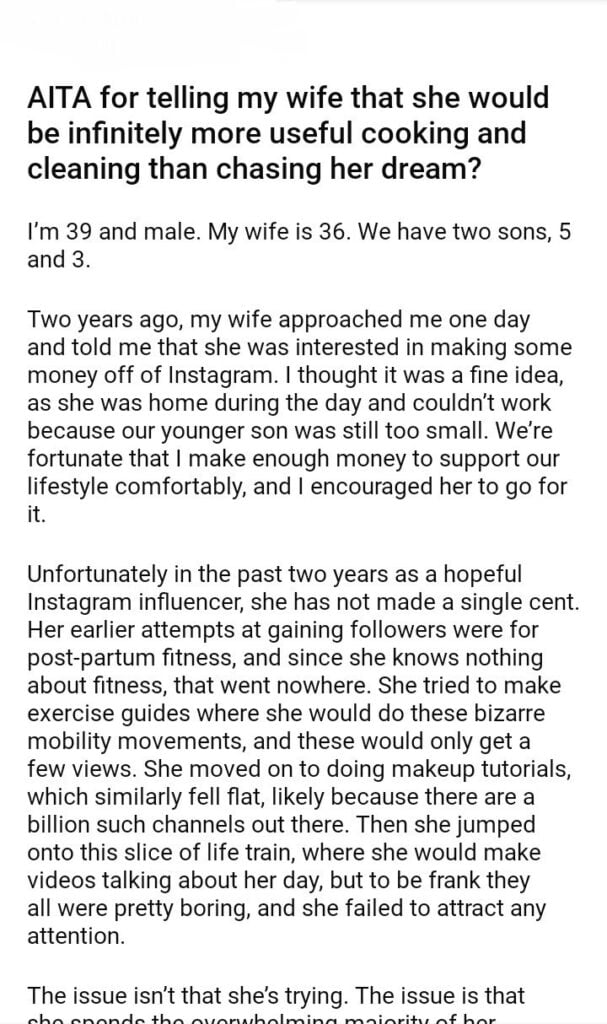 AITA for telling my wife that she would be infinitely more useful cooking and cleaning than chasing her dream?