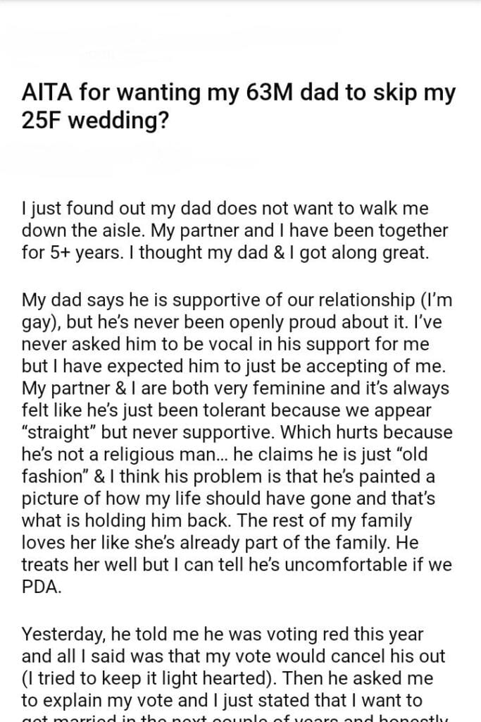 AITA for wanting my 63M dad to skip my 25F wedding?