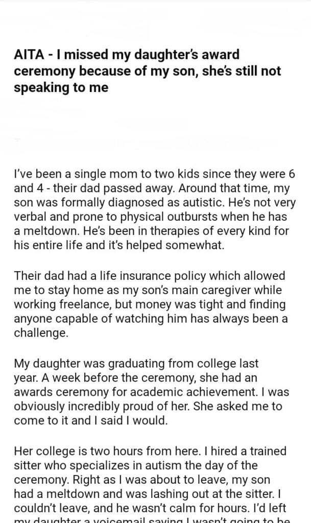 AITA – I missed my daughter’s award ceremony because of my son, she’s still not speaking to me