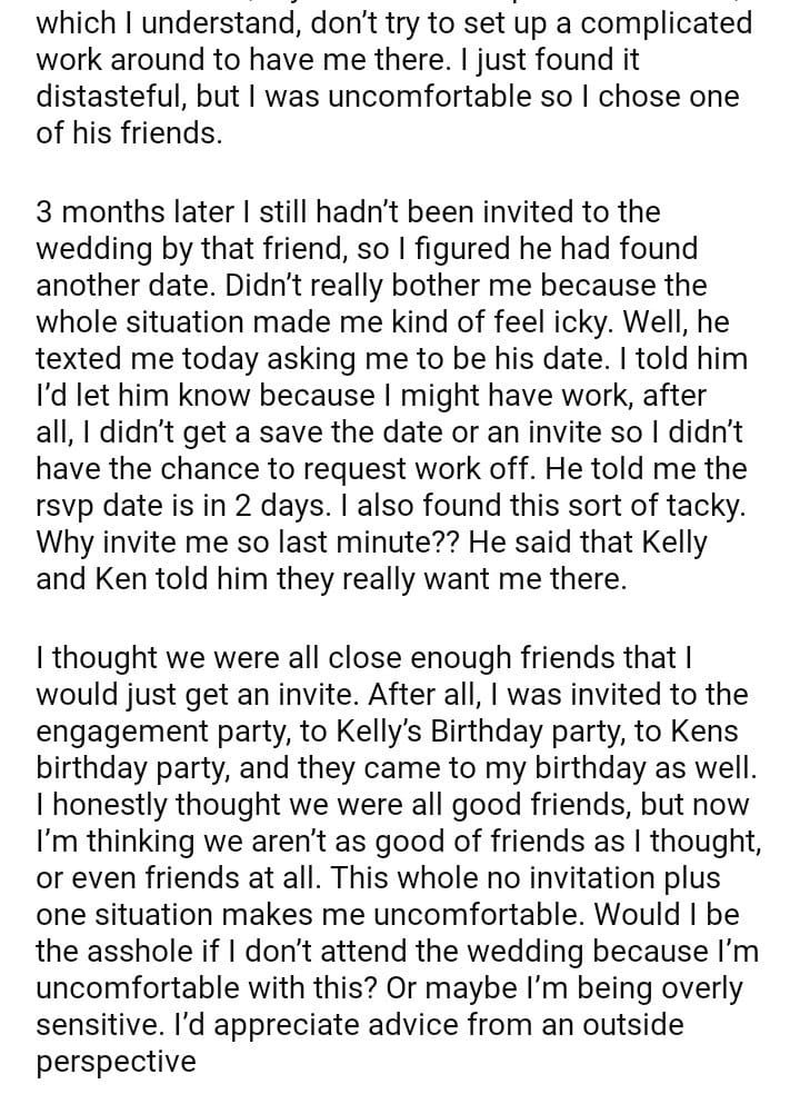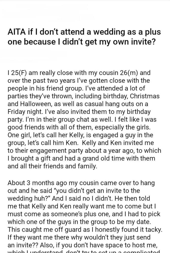 AITA if I don’t attend a wedding as a plus one because I didn’t get my own invite?
